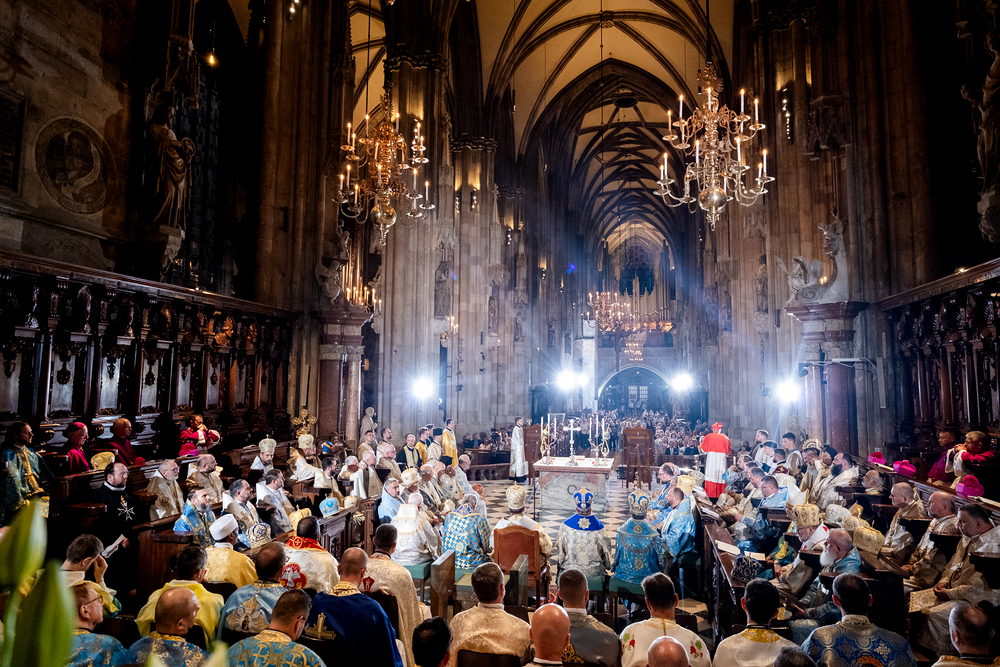 Gottesdienst im byzantinischen Ritus war Mittwochabend liturgischer Höhepunkt der Wiener Vollversammlung der Bischöfe der katholischen Ostkirchen Europas - Kardinal Schönborn in Predigt: "In der Liturgie sind wir ganz besonders mit dem Himmel verbunden", gerade in Zeiten des Krieges und der Not. Wir waren mit der Kamera dabei.